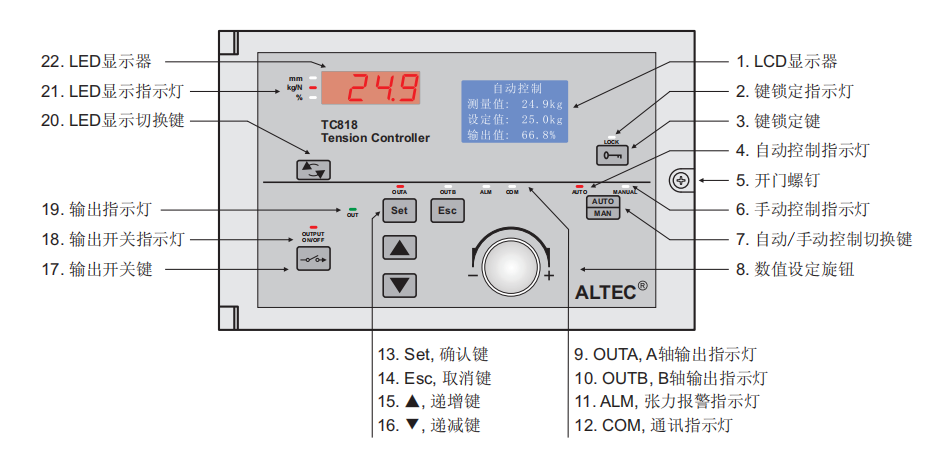 • 當控制器工作在自動控制模式時,自動控制指示燈AUTO)點亮,可旋轉數值設定旋鈕或按遞增鍵/遞減鍵修改張力設定值,按AUTO/MAN鍵可切換到手動控制模式。